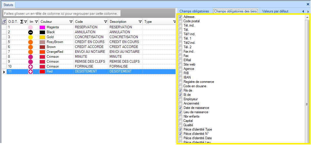 La liste des champs obligatoires des tiers qui correspondent à un statut |