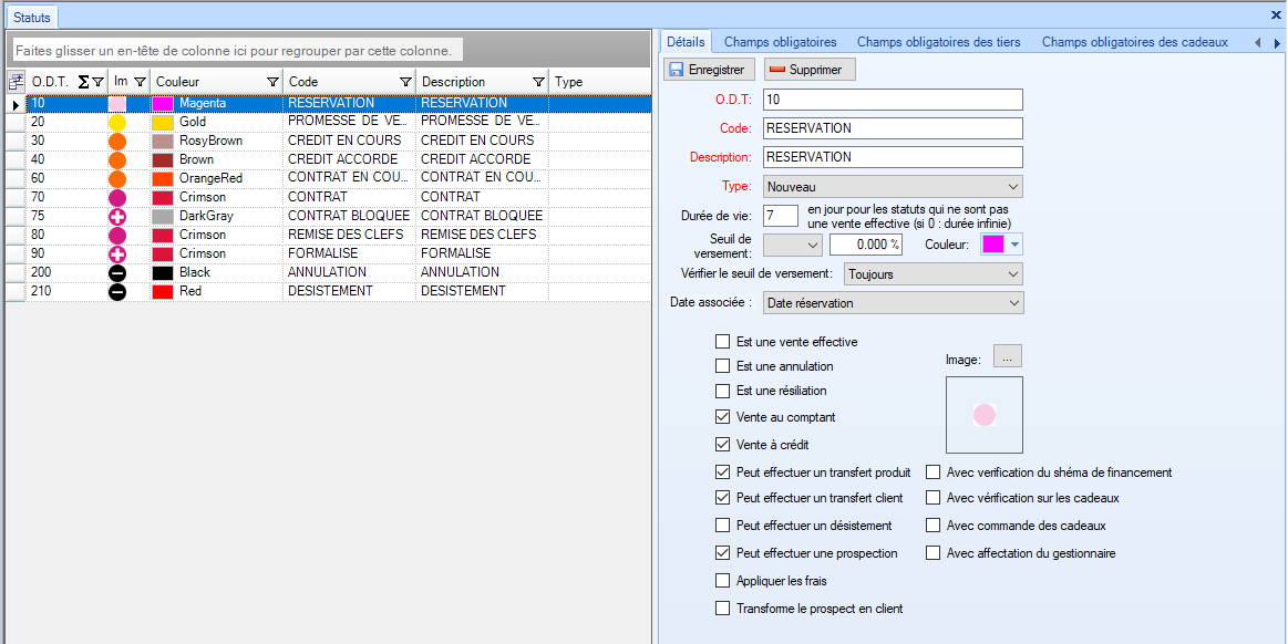 Listes déroulantes d’affectation des valeurs par défaut pour les statuts qui peut prendre un dossier de vente |