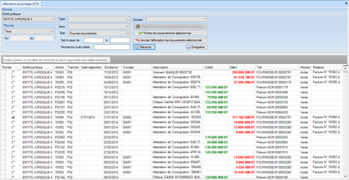 La liste visualise les mouvements d’encaissement et de décaissements saisis dans tous les autres modules. Le but de ce masque est de pouvoir effectuer un rapprochement bancaire en pointant tous les mouvements qui ont réellement impacter les comptes bancaire ou caisse.