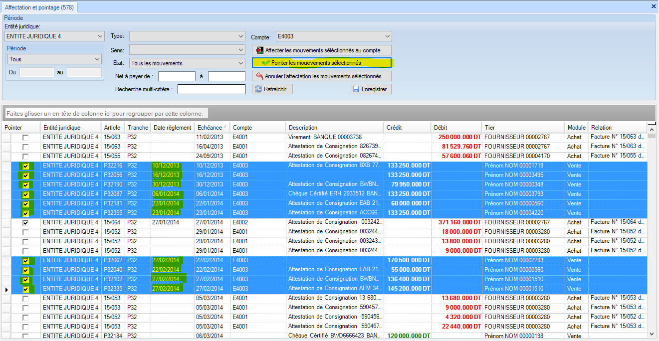 En cliquant sur le bouton « Pointer les mouvements sélectionnés» le système coche la colonne pointer et affecte la date échéance à la date de règlement de tous les mouvements sélectionnés. Les dates de règlements restent modifiables. Si le mouvement n’a pas de compte affecté, le système ne le pointe pas.