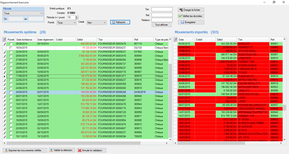 Le système valide les mouvements sélectionnés manuellement, il affecte la date de règlement et il rend la ligne des mouvements système coloré en vert Remarque : La date règlement = la date du mouvement de la ligne correspondante de la liste importés |