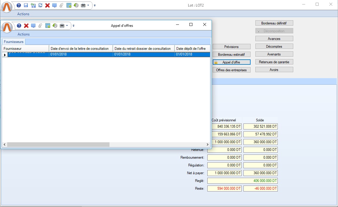 Le bouton « Appel d’offre » permet de gérer les fournisseurs présélectionnés pour le lot, et les détails qui concernent leur dépôt d’offre :