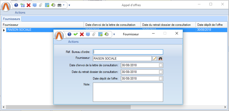 Le bouton « Appel d’offre » permet de gérer les fournisseurs présélectionnés pour le lot, et les détails qui concernent leur dépôt d’offre :