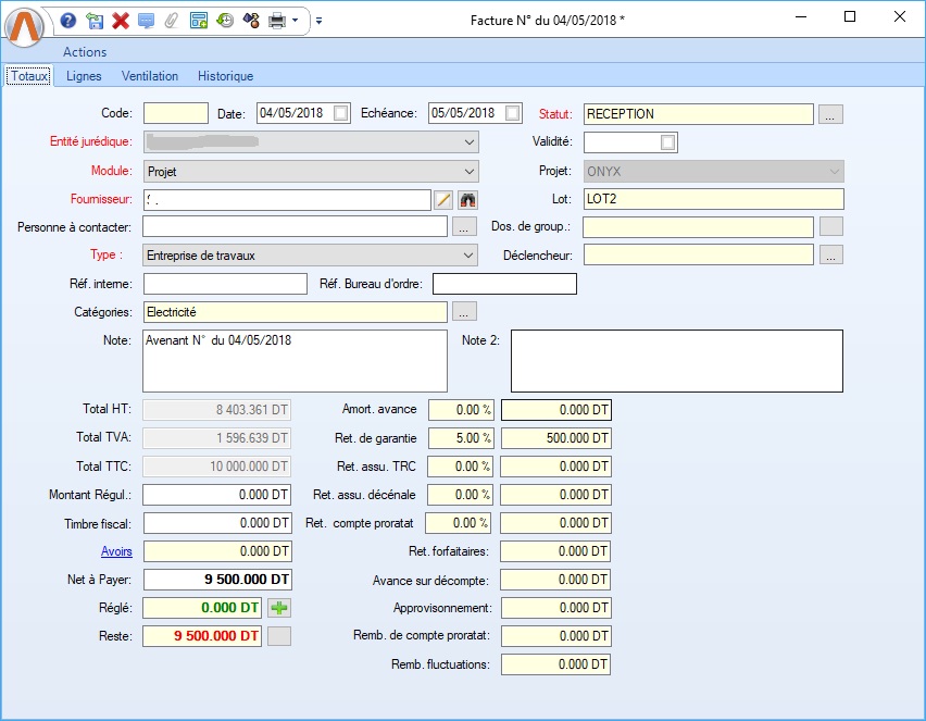 - Si la case est cochée, le système rend le montant «Retenue d’assurance décennale » saisissable manuellement