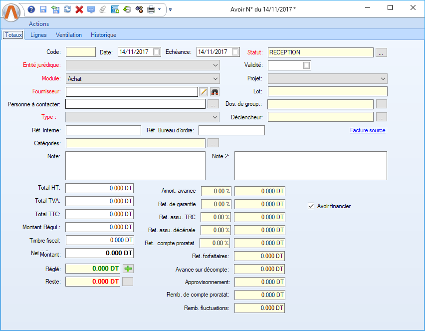 Lorsque l'utilisateur renseigne le Net à payer le système calcule l'impact sur le montant de régulation sans toucher le Total TTC. Montant régul = ((Net à payer - Timbre fiscal) - (Total TTC + Remb. Fluctuations + Avance sur décompte) +(Montant amortissement avance + Montant retenue de garantie + Montant compte prorata + Montant retenue d'assurance décanale + Montant de la retenue d'assurance tous risque chantier + Valeur approvisionnement) |