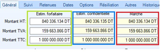 Remarque1 : Le devis du fournisseur retenu lors du dépouillement représente le « bordereau définitif » Remarque2 : Les champs " Montant HT ", " Montant TVA ", " Montant TTC ", " Retenu non remboursable " et " Net à payer " du marché sont remplis à partir du bordereau définitif. Remarque3 : Si on ne sélectionne pas un fournisseur, le système garde toujours la fiche "Bordereau définitif" vide. |