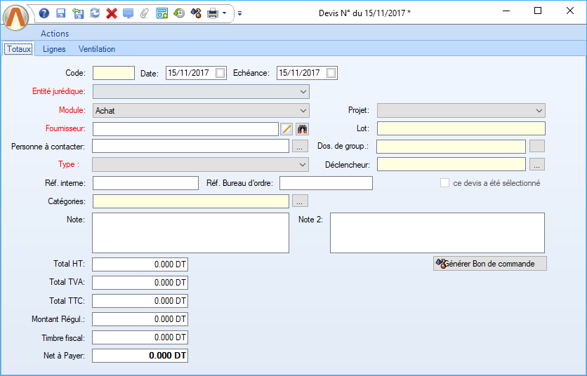 ==> Si on clic sur le bouton "Appliquer la ventilation par défaut", le système répartie la ventilation selon le paramétrage par défaut effectué dans l'écran " Projet ". ==>Si on clic sur le bouton "Projet", le système affiche la liste des projets Remarque 1: Si on choisit un projet à partir de la liste déroulante (Sous l'onglet "Totaux"), le système applique une ventilation de 100% sur ce dernier. Remarque 2: La somme des taux de ventilation doit être égale à 100% |