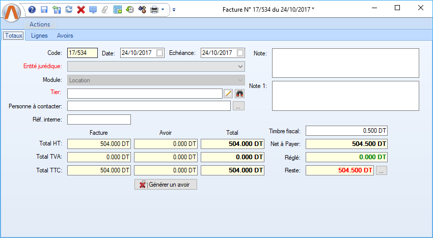 Lorsqu'on clic sur le bouton "Générer un avoir", le système crée un avoir pour le document en question. Remarque 1: Pour garantir le bon fonctionnement, il est fortement conseillé d'utiliser les avoirs total; c'est à dire un avoir qui annule le montant de la facture en question. Pour procéder à la correction d'une facture il faut : 1 - Créer un avoir total (Les quantités dans les lignes égales 1) 2 - Corriger les échéances en question en effectuant les ajustements nécessaires 3 - Régénérer la factures en effectuant à nouveau l'appel d'échéances 4 - Effectuer le règlement de la facture Remarque 2: Si la facture est réglée, il faut: - Refaire les étapes de 1 à 3 cité ci-dessus (dans la remarque 1) - Ouvrir la fiche du règlement - Supprimer l'affectation - Affecter la nouvelle facture en faisant clic droit --> Ajouter --> Double clic sur la facture en question. |