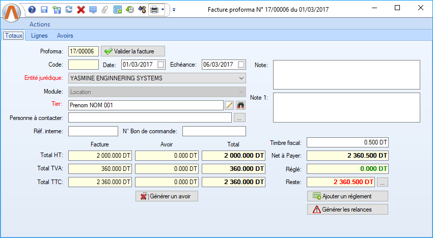 En lecture seule, auto généré lorsqu'on appuie sur le bouton "Valider la facture" |