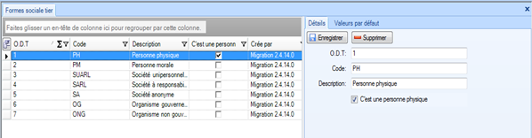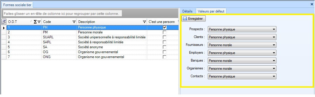 Liste déroulante des formes sociale qu’on peut attribuer pour chaque tiers |