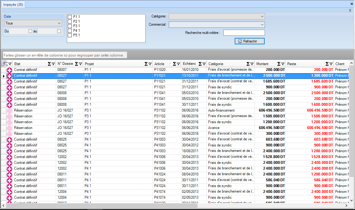 La liste visualise la liste des documents impayés des dossiers de ventes en indiquant les champs cité ci dessous