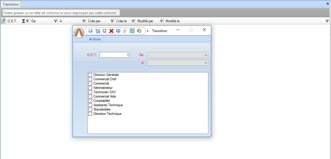 Dans le masque « Transition » les cases à cocher représentent les rôles des acteurs qui peuvent modifier le statut d’une « Prospection de terrain». |