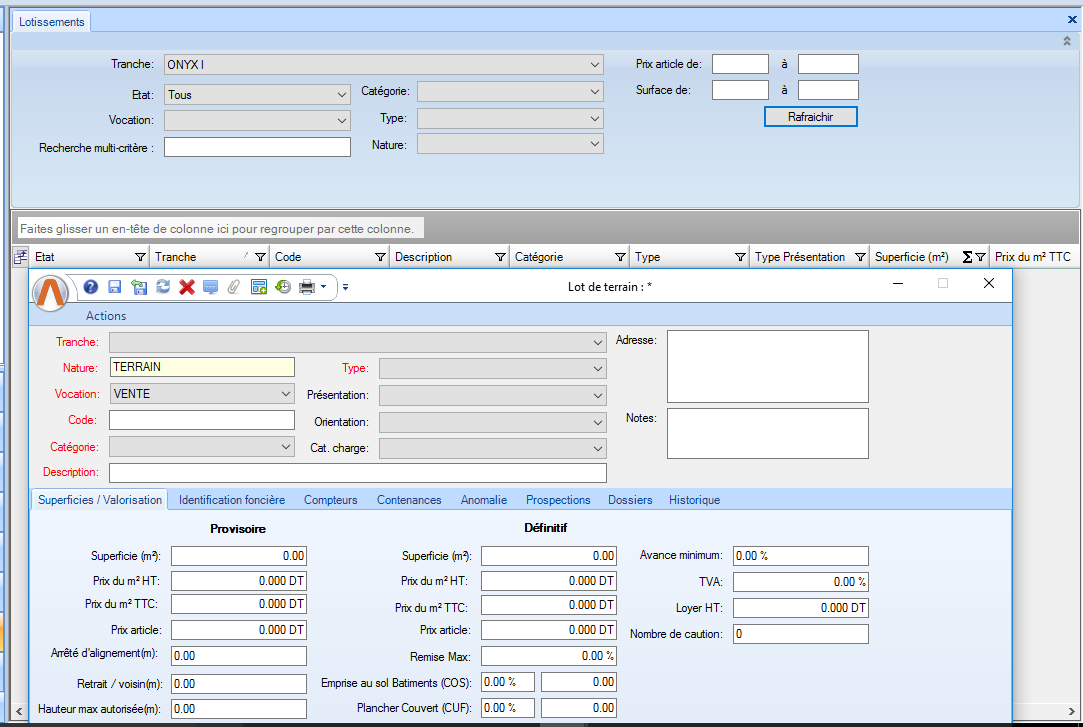 Liste déroulante de types qui ont la nature "Lot de terrain" |