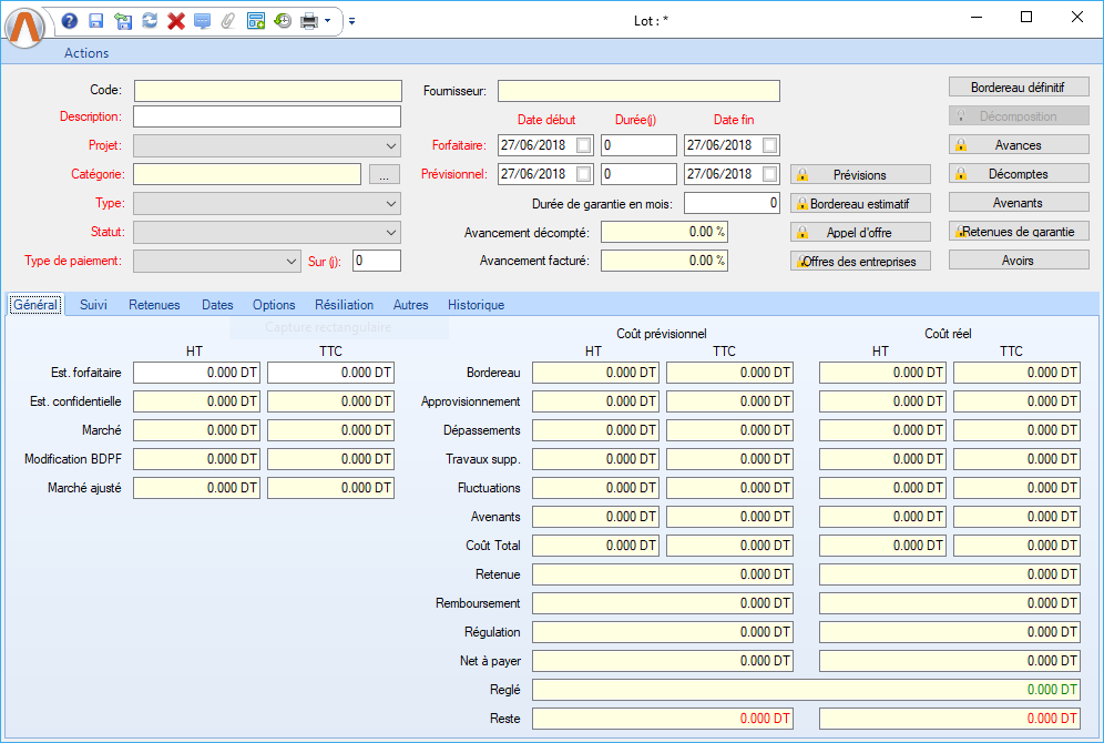 Remarque : La modification de l’estimation des montants de marché, de date début, durée de travaux et la date fin forfaitaires varie selon les habilitations accordées à un rôle. |