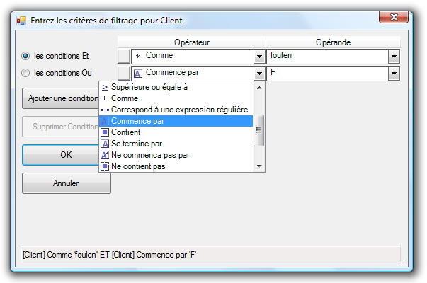 Tous les masques de liste du système présentent des possibilités de filtrage très évoluées, pour permettre une manipulation et un accès rapide aux données. Chaque colonne de la liste et en se basant sur le type de ses données va présenter des critères spécifiques.