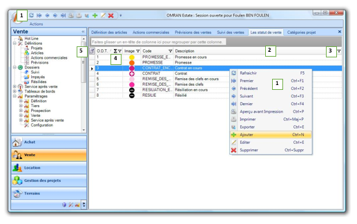 Dans toutes les listes de la solution pour afficher les actions pouvant être effectués sur celle-ci, il vous suffit de cliquer sur le bouton droit de votre souris pour afficher son menu contextuel. Vous remarquerez que la liste des actions présentes (zone 1) sont représentées dans la mini barre d’outils affichée au haut et à gauche de votre page principale.