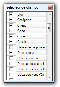 Pour tous les masques de liste, les sélecteurs de champs vous permettent de visualiser ou de masquer les colonnes à votre guise. Pour cela il suffit de cocher (pour visualiser) ou de décocher (pour masquer) les colonnes choisies.