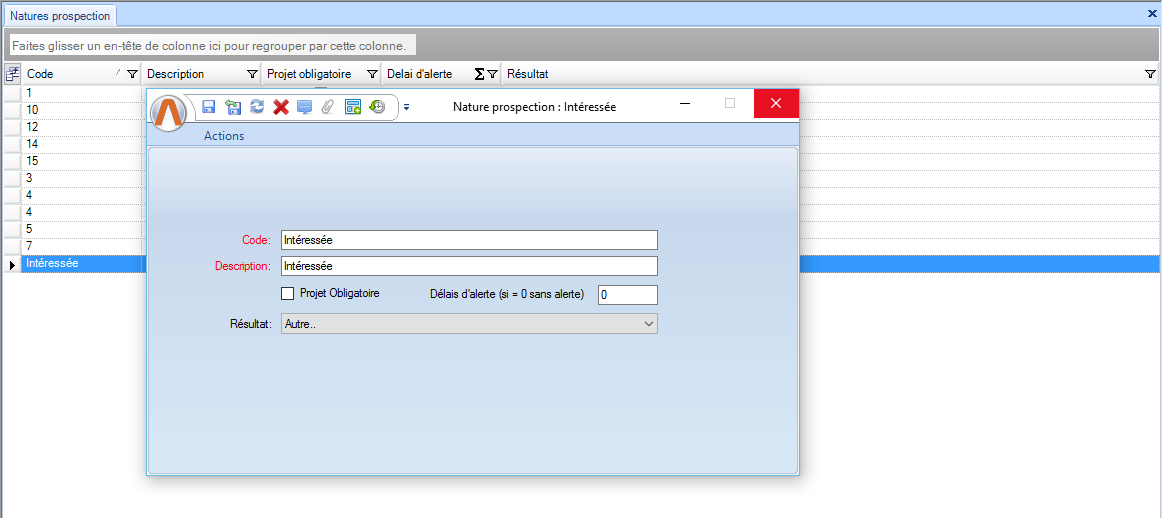 Pour une nature de prospection, si la case « Projet obligatoire » est cochée, le choix d’un projet dans la fiche prospection devient obligatoire sinon, il devient optionnel. |