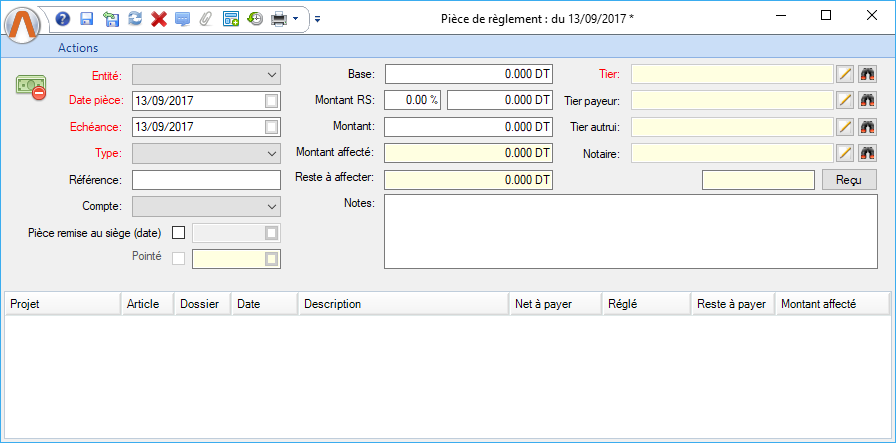 Remarque: Les champs Base, Pourcentage RS et montant RS si le paramètre "Avec gestion de la retenue à la source" (Dans l’écran paramètres système ) est vrai