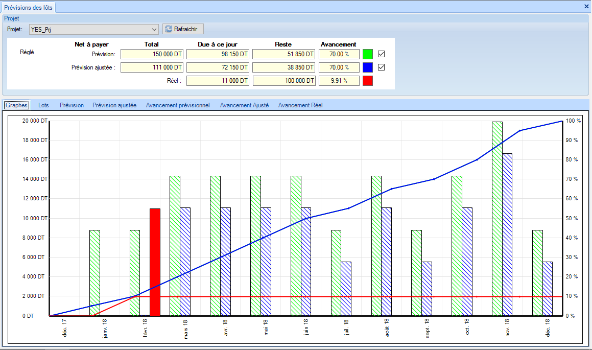 Σ des montants prévisionnels net à payer * Taux d'avancements des prévisions forfaitaire (définit dans l'écran "Modifier les prévisions") par lot par mois. |