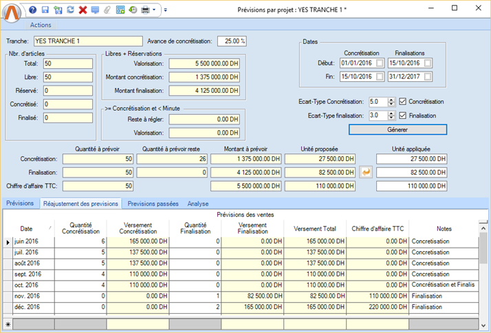La liste visualise les détails de prévisions des ventes à partir du mois actuel en affichant :