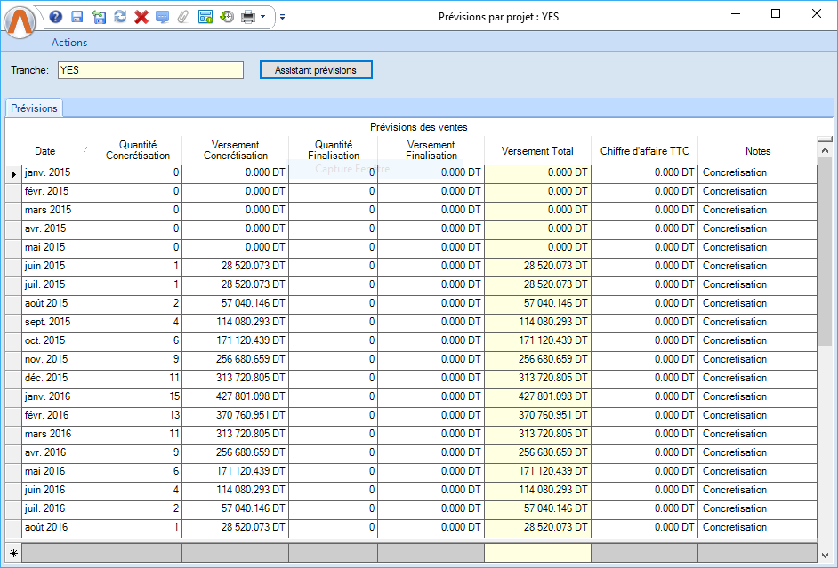 Lorsqu'on clic sur le bouton "Assistant prévisions" le système affiche l'écran suivant: