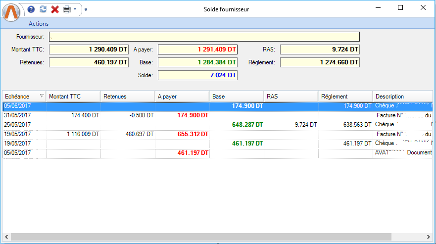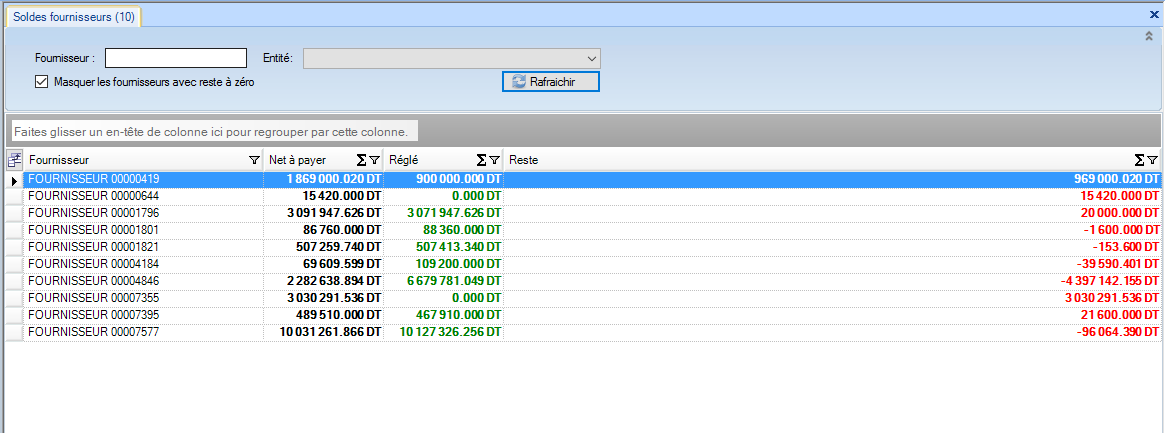 Remarque: Si on fait un double clique sur une ligne, le système affiche la liste détaillées des factures, documents à régler et règlements du fournisseur sélectionné