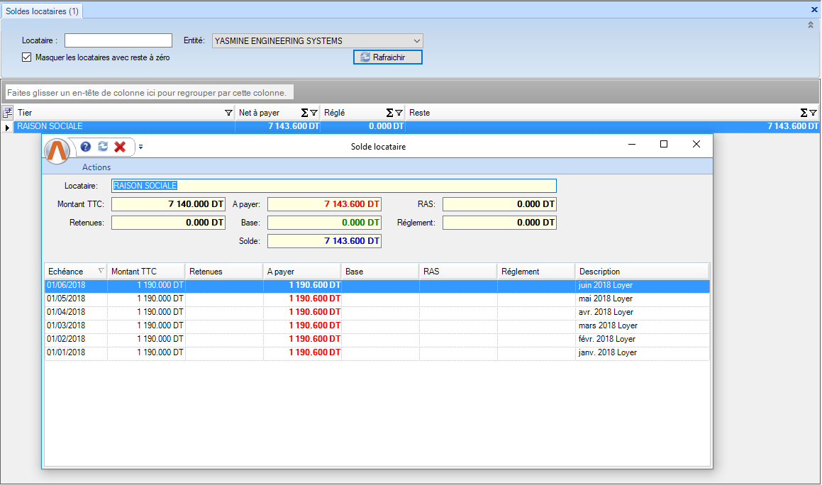 Remarque: Lorsqu'on fait un double clic sur une ligne, le système ouvre la fiche correspondante (Soit le dossier de location /syndic, soit la facture, soit le règlement ) |