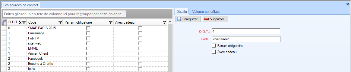 Liste déroulante des sources de contacts. A la création d’une « Prospections » ou un « Prospects express », la source de contact choisi sera affectée par défaut dans la fiche. |