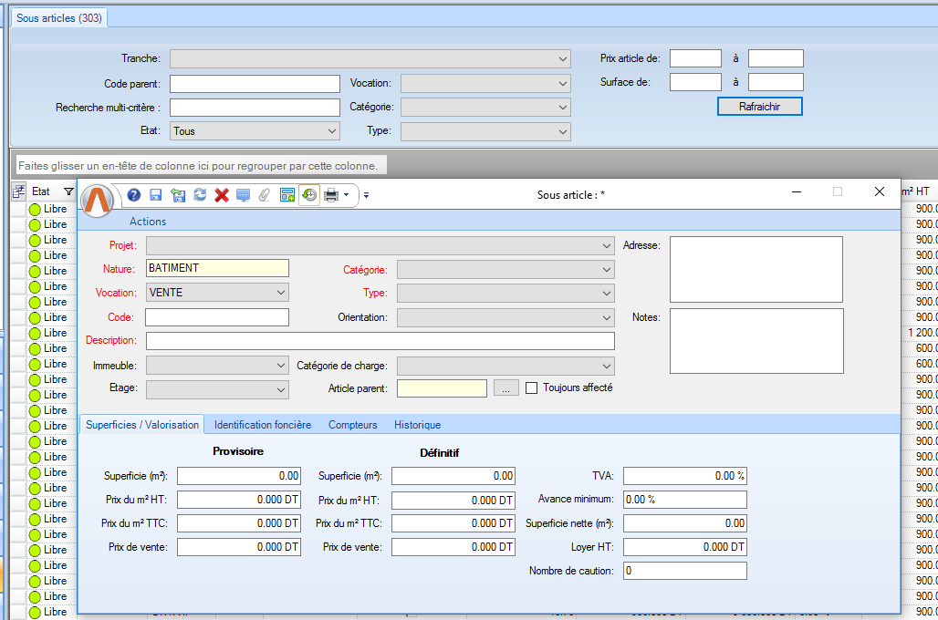 Liste déroulante de types qui ont la nature "Bâtiment" et qui sont paramétrés "Pour les sous articles" |