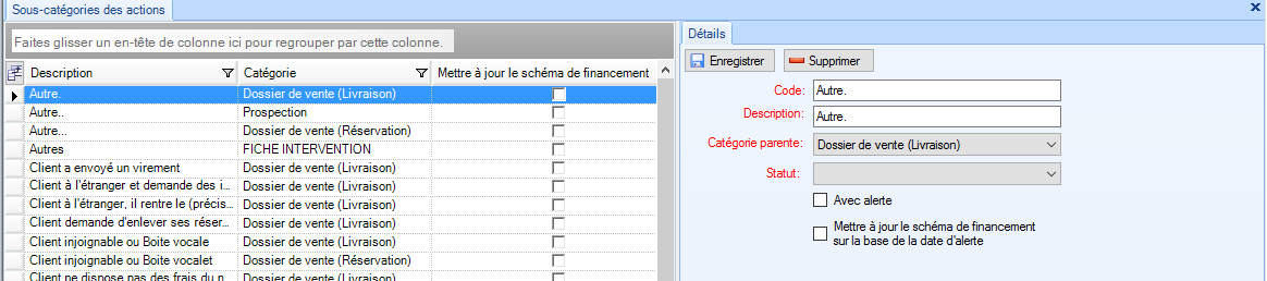 Si l'utilisateur effectue une action et il choisi un résultat paramétré " Mettre à jour le schéma de financement sur la base de la date alerte ", le système met à jour les dates des documents qui ont une date inférieur à la date alerte mis dans l'action et qui ont un reste à payer supérieur à 0.
