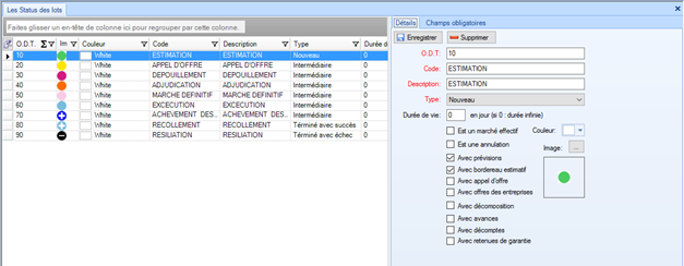 Sous l’onglet « détails » du masque « Les Statuts des lots », les cases à cocher représentent les options activées dans le masque « Lots » qui correspondent un statut sélectionné de la liste. Exemple :