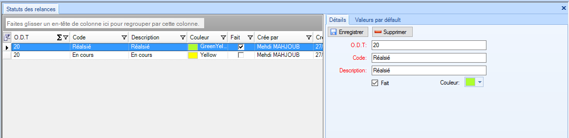 Liste déroulante des statuts des relances |