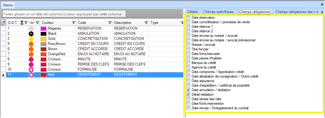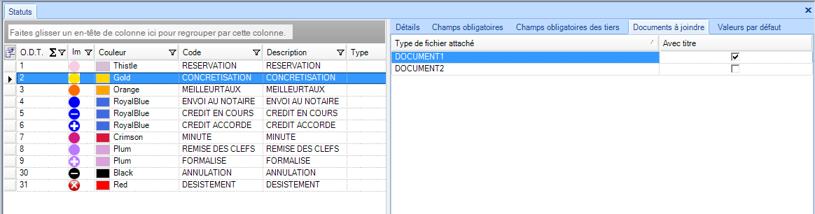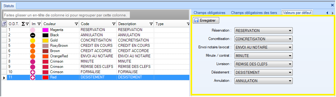 Listes déroulantes d’affectation des valeurs par défaut pour les statuts qui peut prendre un dossier de vente |
