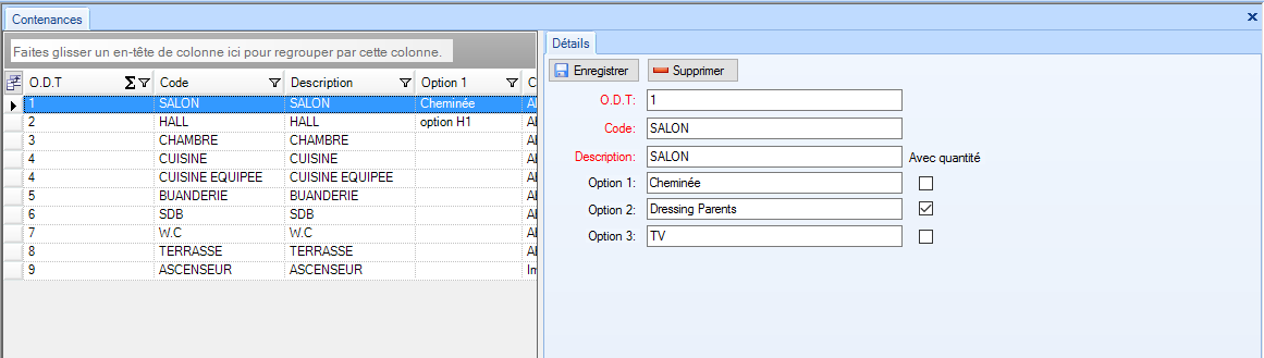 Les options qui peuvent être affectées pour chaque contenance Exemple: Un salon peut contenir une cheminée, une télévision et un dressing |