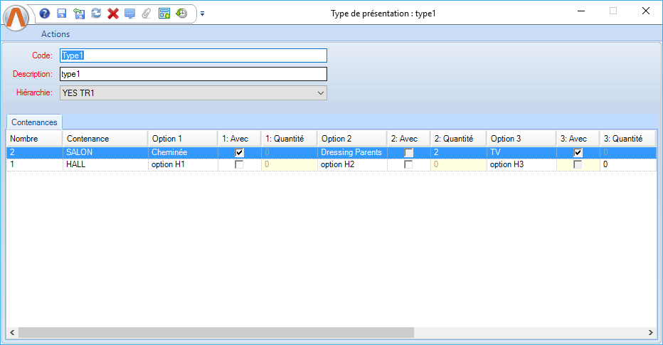 Liste des constituants d’un article, exemple : Salle à manger, Cuisine … Remarque: On choisissant une contenance, le système charge aussi les options paramétrées. |