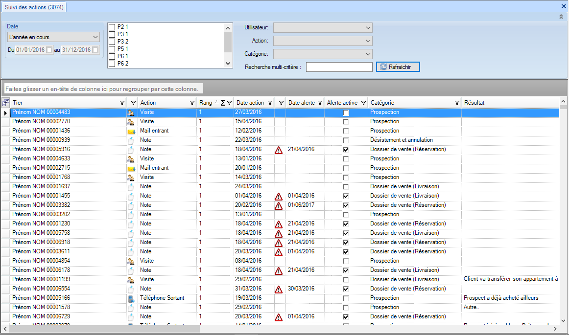 Catégorie action (Prospect, Prospection, Dossier de vente, Transfert..) |