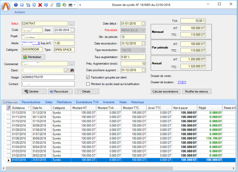 Lorsqu'on clic sur le bouton "Détails", le système affiche un résumé des montants de location et de syndic (Si on les gère dans le même dossier ) |