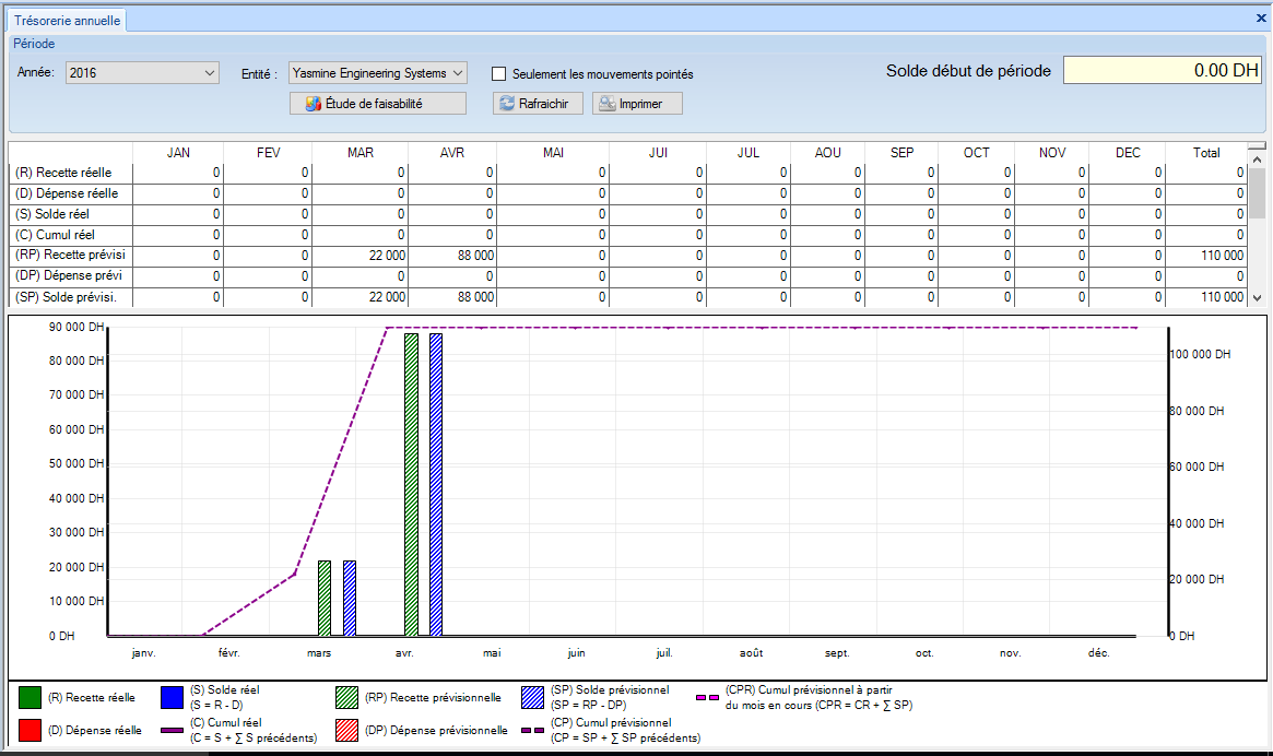 Le système affiche un mouvement réel dans la date de pointage avec le montant réglé (ou payé) (Si la date est inférieur ou égale le mois en cours)