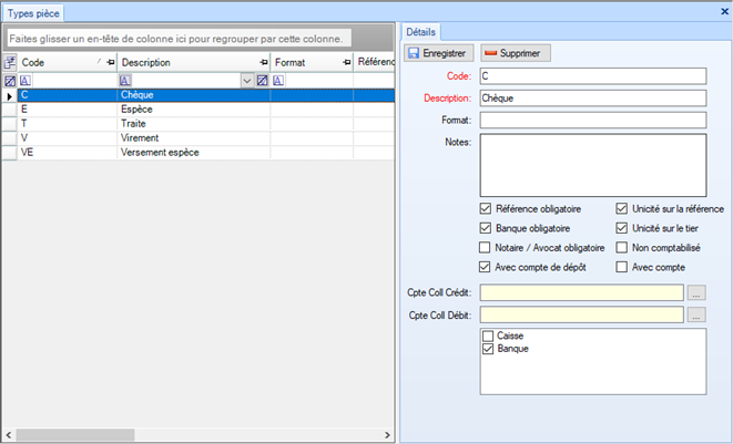 Lors de la création d’un règlement le système filtre les comptes selon les natures affectées au type sélectionné. |